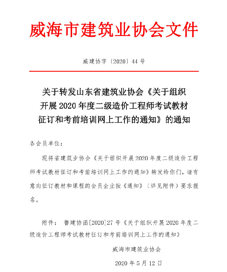- 當(dāng)前位置:首頁 >文件公告>關(guān)于轉(zhuǎn)發(fā)山東省建筑業(yè)協(xié)會(huì)《關(guān)于組織 開展2020年度二級(jí)造價(jià)工程師考試教材 征訂和考前培訓(xùn)網(wǎng)上工作的通知》的通知