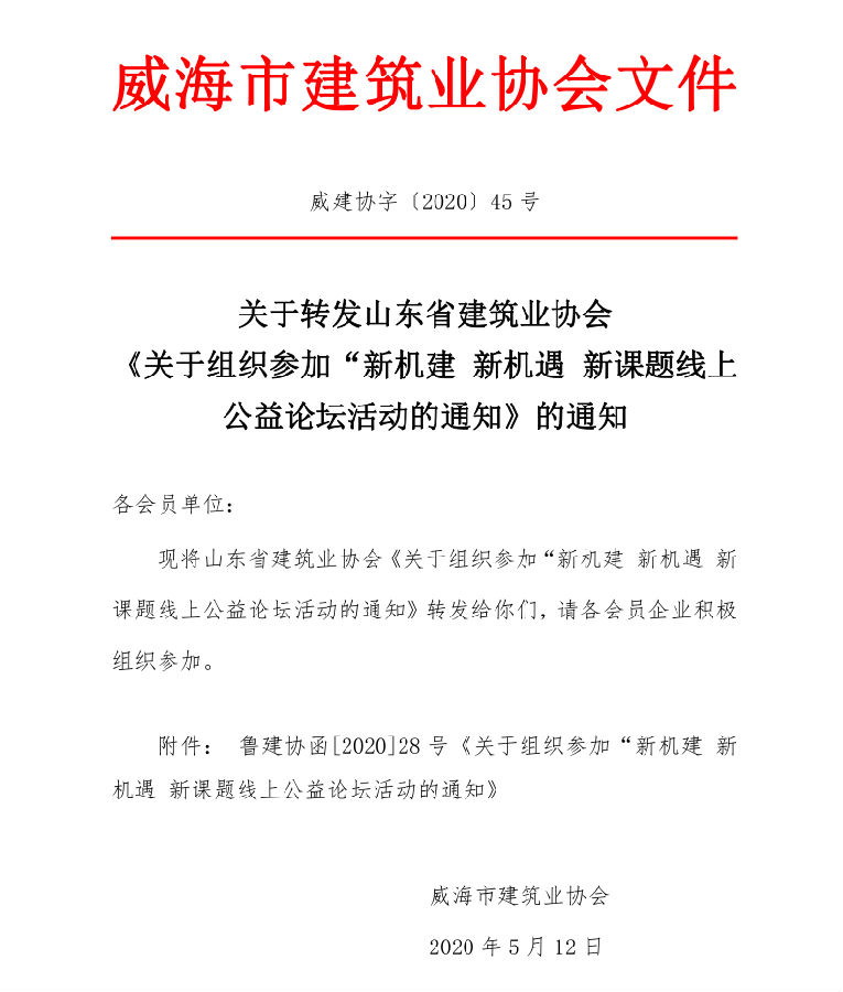 關(guān)于轉(zhuǎn)發(fā)山東省建筑業(yè)協(xié)會(huì) 《關(guān)于組織參加“新機(jī)建 新機(jī)遇 新課題線上公益論壇活動(dòng)的通知》的通知