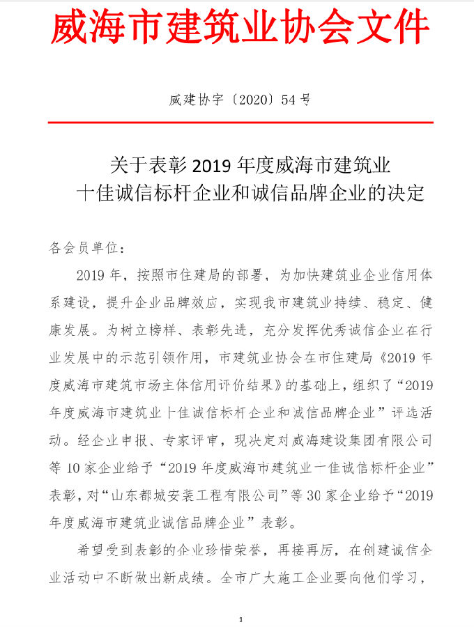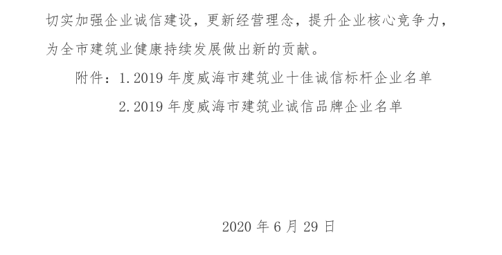 >關(guān)于表彰2019年度威海市建筑業(yè)十佳誠信標(biāo)桿企業(yè)和誠信品牌企業(yè)的決定