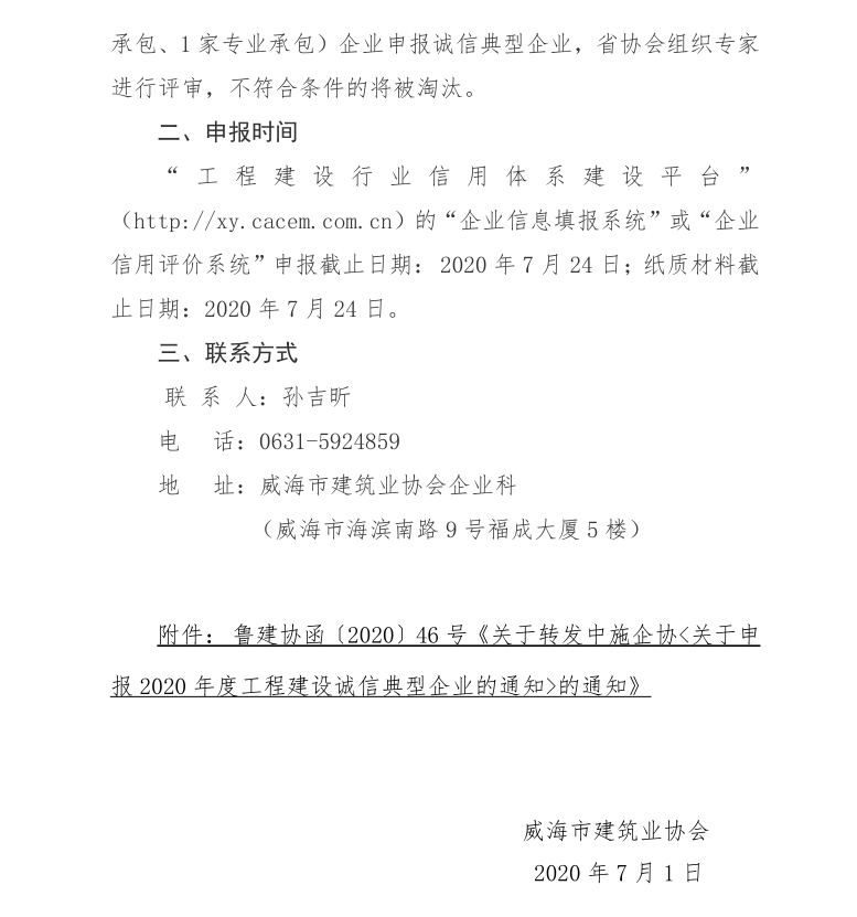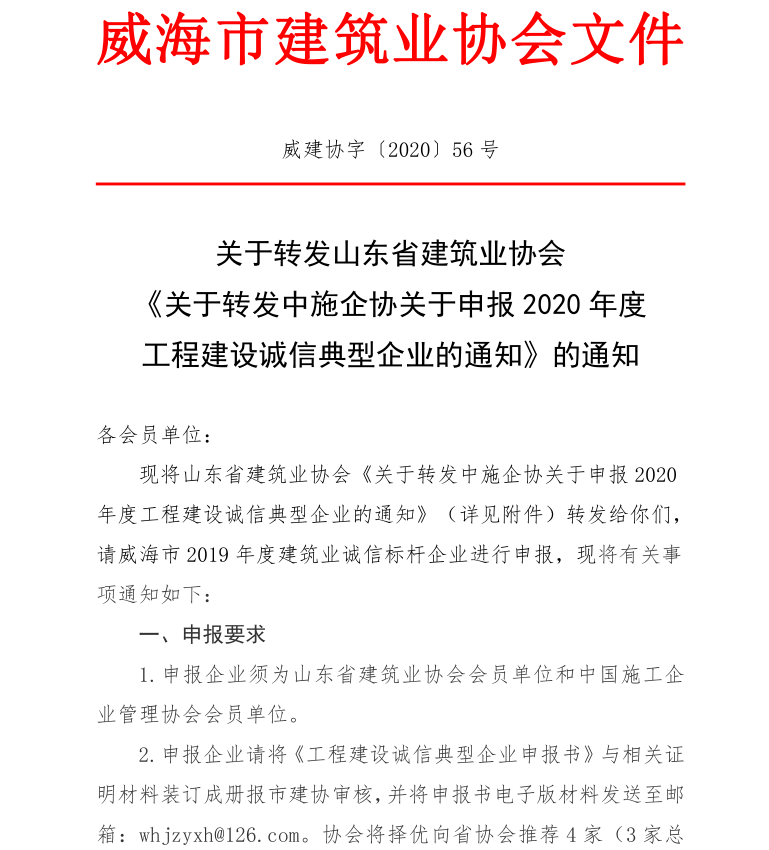 >關于轉(zhuǎn)發(fā)山東省建筑業(yè)協(xié)會 《關于轉(zhuǎn)發(fā)中施企協(xié)關于申報2020年度 工程建設誠信典型企業(yè)的通知》的通知