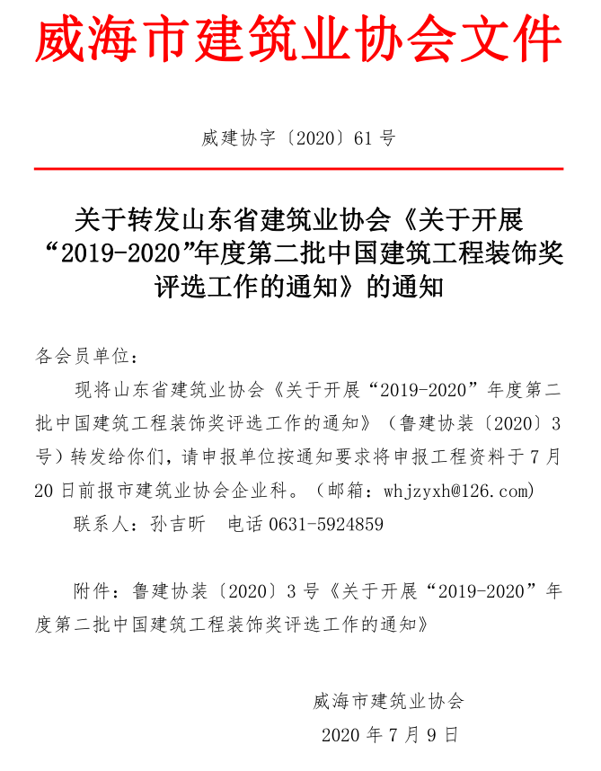 關(guān)于轉(zhuǎn)發(fā)山東省建筑業(yè)協(xié)會《關(guān)于開展“2019-2020”年度第二批中國建筑工程裝飾獎評選工作的通知》的通知