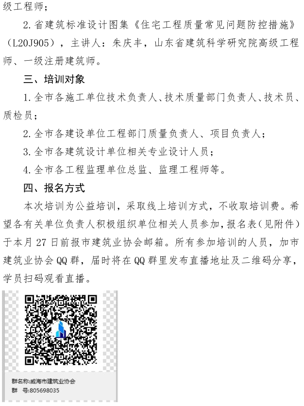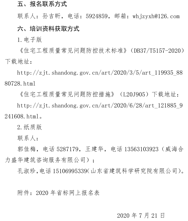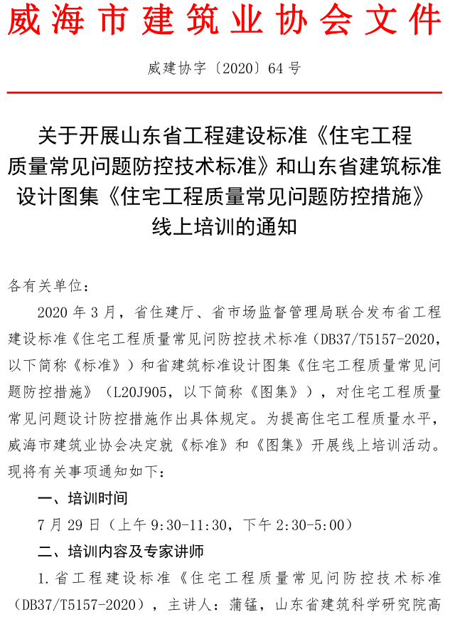>關于開展山東省工程建設標準《住宅工程 質量常見問題防控技術標準》和山東省建筑標準設計圖集《住宅工程質量常見問題防控措施》線上培訓的通知