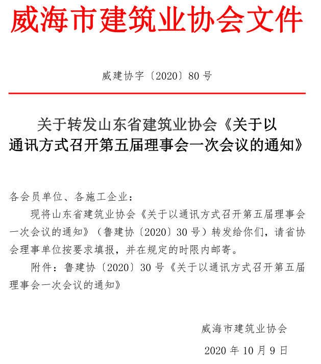 >關(guān)于轉(zhuǎn)發(fā)山東省建筑業(yè)協(xié)會《關(guān)于以 通訊方式召開第五屆理事會一次會議的通知》