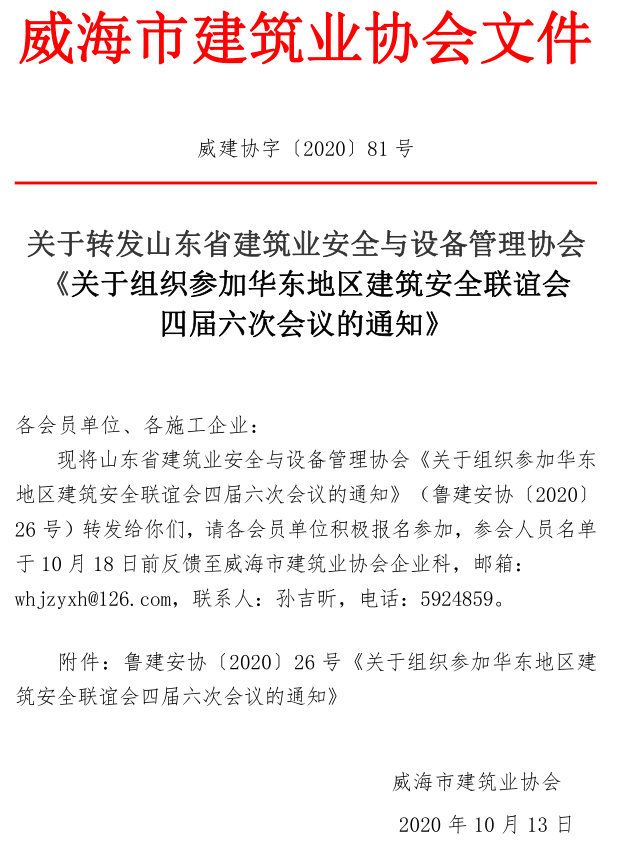 關(guān)于轉(zhuǎn)發(fā)山東省建筑業(yè)安全與設(shè)備管理協(xié)會《關(guān)于組織參加華東地區(qū)建筑安全聯(lián)誼會四屆六次會議的通知》