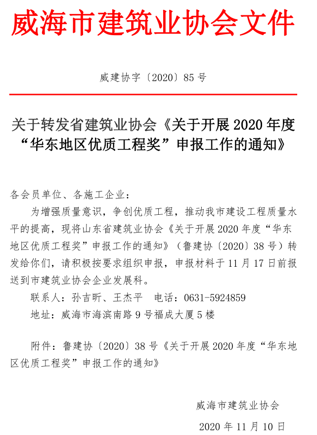 關(guān)于轉(zhuǎn)發(fā)省建筑業(yè)協(xié)會(huì)《關(guān)于開(kāi)展2020年度“華東地區(qū)優(yōu)質(zhì)工程獎(jiǎng)”申報(bào)工作的通知》