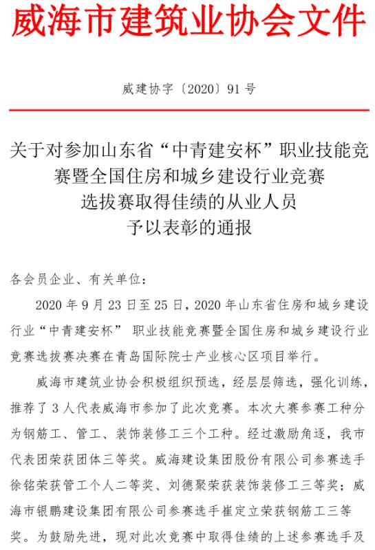 關(guān)于對參加山東省“中青建安杯”職業(yè)技能競賽暨全國住房和城鄉(xiāng)建設(shè)行業(yè)競賽 選拔賽取得佳績的從業(yè)人員予以表彰的通報