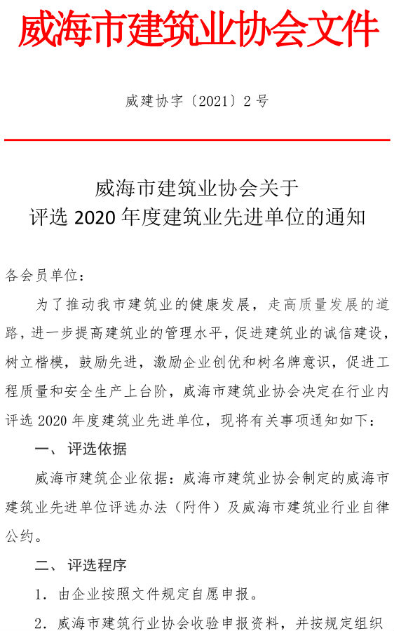 威海市建筑業(yè)協(xié)會關于 評選2020年度建筑業(yè)先進單位的通知