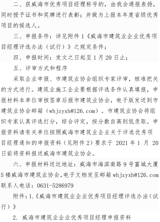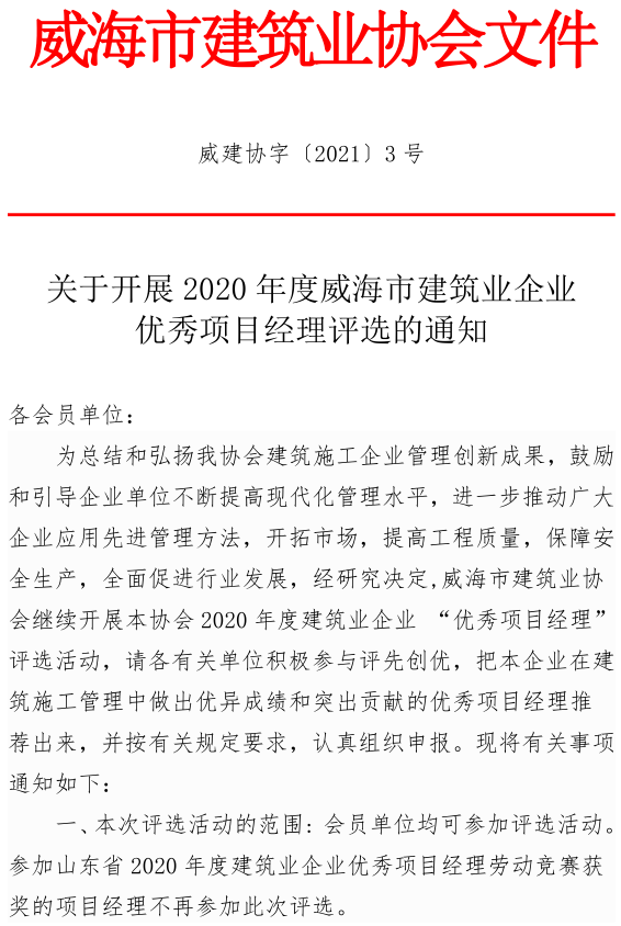 >關(guān)于開(kāi)展2020年度威海市建筑業(yè)企業(yè)優(yōu)秀項(xiàng)目經(jīng)理評(píng)選的通知