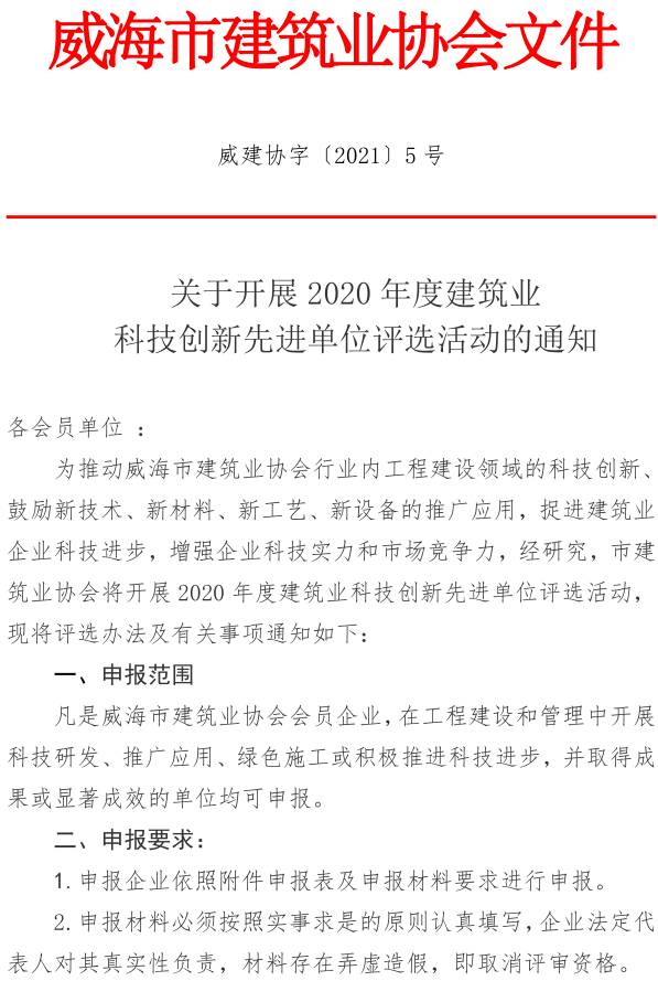 關(guān)于開展2020年度威海市建筑業(yè) “先進工作者”“巾幗模范”的通知