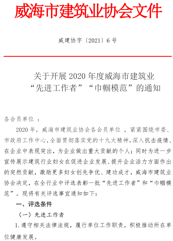 關于開展2020年度威海市建筑業(yè) “先進工作者”“巾幗模范”的通知
