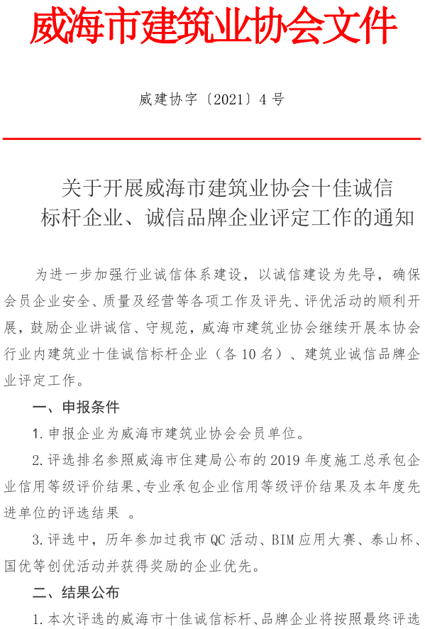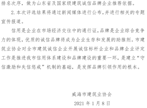 >關(guān)于開展威海市建筑業(yè)協(xié)會十佳誠信 標(biāo)桿企業(yè)、誠信品牌企業(yè)評定工作的通知