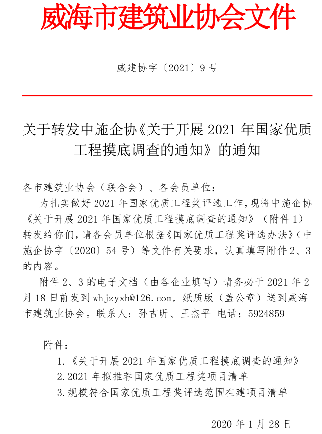 - 當(dāng)前位置:首頁(yè) >文件公告>關(guān)于轉(zhuǎn)發(fā)中施企協(xié)《關(guān)于開(kāi)展2021年國(guó)家優(yōu)質(zhì)工程摸底調(diào)查的通知》的通知