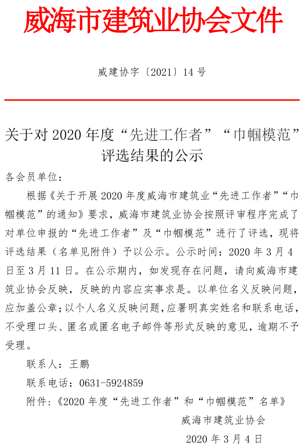 >關(guān)于對2020年度“先進工作者”“巾幗模范”評選結(jié)果的公示