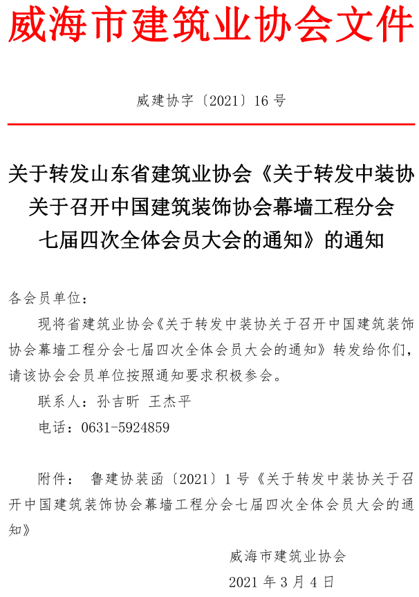 >關(guān)于轉(zhuǎn)發(fā)山東省建筑業(yè)協(xié)會(huì)《關(guān)于轉(zhuǎn)發(fā)中裝協(xié)關(guān)于召開(kāi)中國(guó)建筑裝飾協(xié)會(huì)幕墻工程分會(huì) 七屆四次全體會(huì)員大會(huì)的通知》的通知