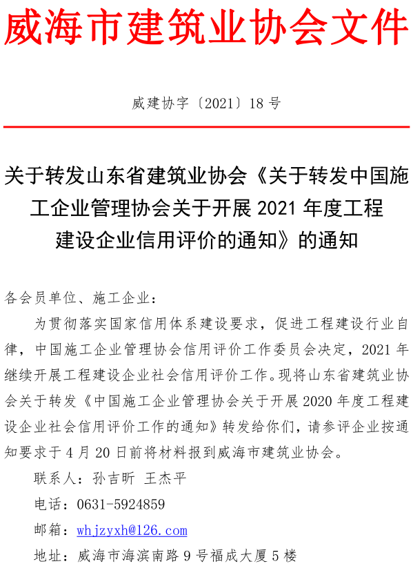 - 當(dāng)前位置:首頁 >文件公告>關(guān)于轉(zhuǎn)發(fā)山東省建筑業(yè)協(xié)會《關(guān)于轉(zhuǎn)發(fā)中國施工企業(yè)管理協(xié)會關(guān)于開展2021年度工程 建設(shè)企業(yè)信用評價的通知》的通知