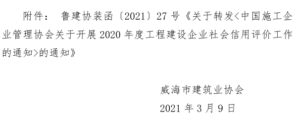 關(guān)于轉(zhuǎn)發(fā)山東省建筑業(yè)協(xié)會《關(guān)于轉(zhuǎn)發(fā)中國施工企業(yè)管理協(xié)會關(guān)于開展2021年度工程 建設(shè)企業(yè)信用評價的通知》的通知