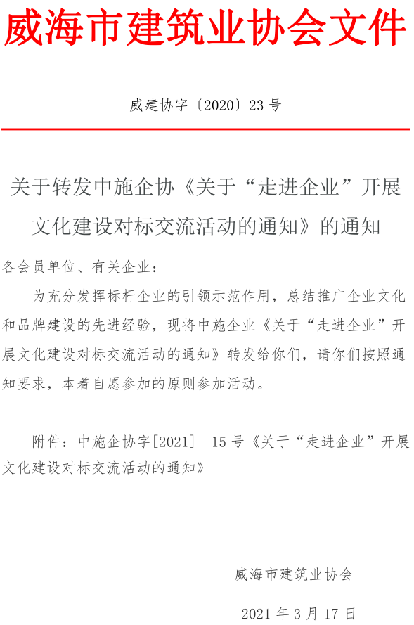 關(guān)于轉(zhuǎn)發(fā)中施企協(xié)《關(guān)于“走進(jìn)企業(yè)”開展 文化建設(shè)對標(biāo)交流活動(dòng)的通知》的通知