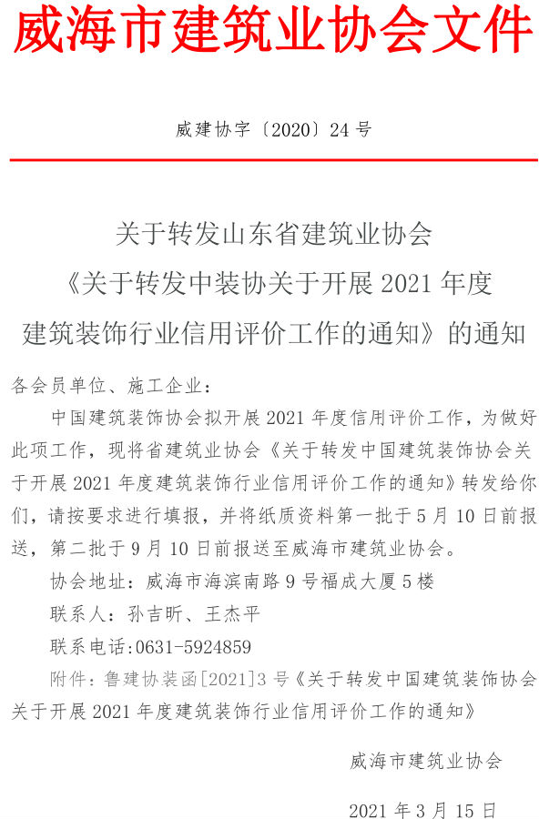 關(guān)于轉(zhuǎn)發(fā)山東省建筑業(yè)協(xié)會 《關(guān)于轉(zhuǎn)發(fā)中裝協(xié)關(guān)于開展2021年度 建筑裝飾行業(yè)信用評價工作的通知》的通知