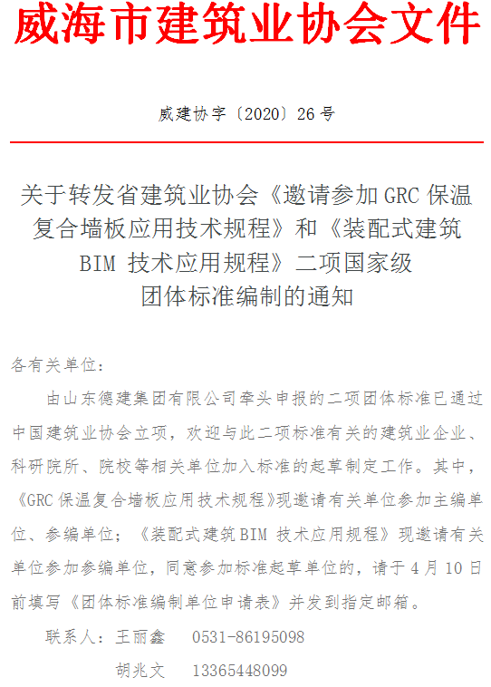 關(guān)于轉(zhuǎn)發(fā)省建筑業(yè)協(xié)會(huì)《邀請參加GRC保溫 復(fù)合墻板應(yīng)用技術(shù)規(guī)程》和《裝配式建筑 BIM 技術(shù)應(yīng)用規(guī)程》二項(xiàng)國家團(tuán)體標(biāo)準(zhǔn)編制的通知