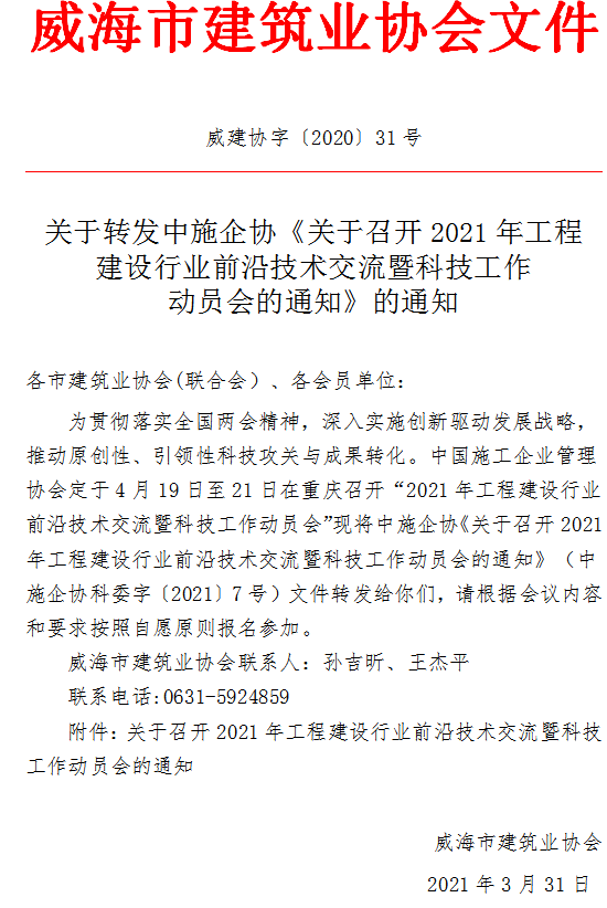 關(guān)于轉(zhuǎn)發(fā)中施企協(xié)《關(guān)于召開2021年工程 建設(shè)行業(yè)前沿技術(shù)交流暨科技工作 動員會的通知》的通知