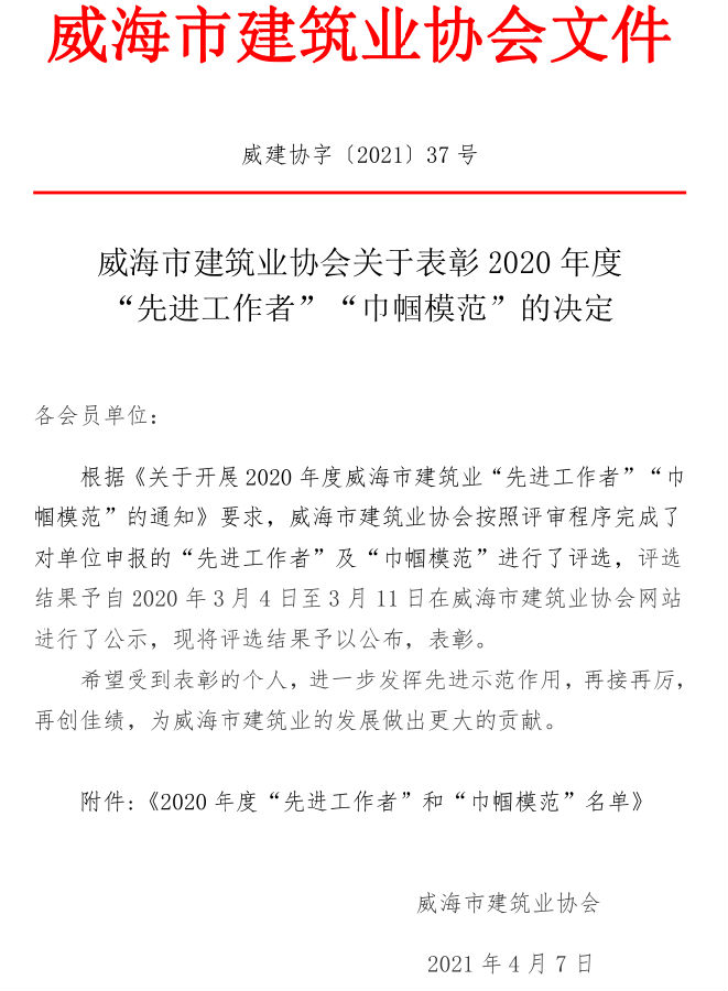 >威海市建筑業(yè)協(xié)會關于表彰2020年度 “先進工作者”“巾幗模范”的決定