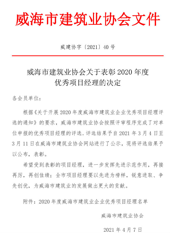 威海市建筑業(yè)協(xié)會關(guān)于表彰2020年度優(yōu)秀項目經(jīng)理的決定