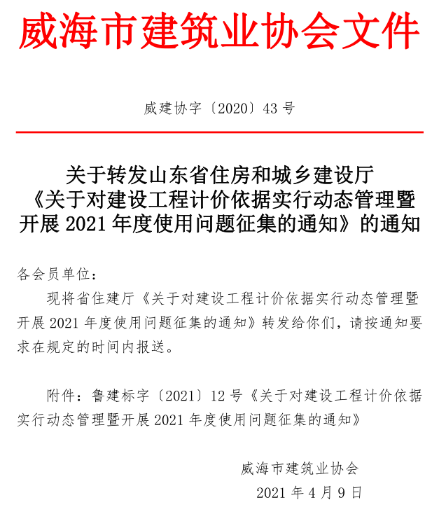 關(guān)于轉(zhuǎn)發(fā)山東省住房和城鄉(xiāng)建設(shè)廳 《關(guān)于對建設(shè)工程計價依據(jù)實行動態(tài)管理暨開展2021年度使用問題征集的通知》的通知