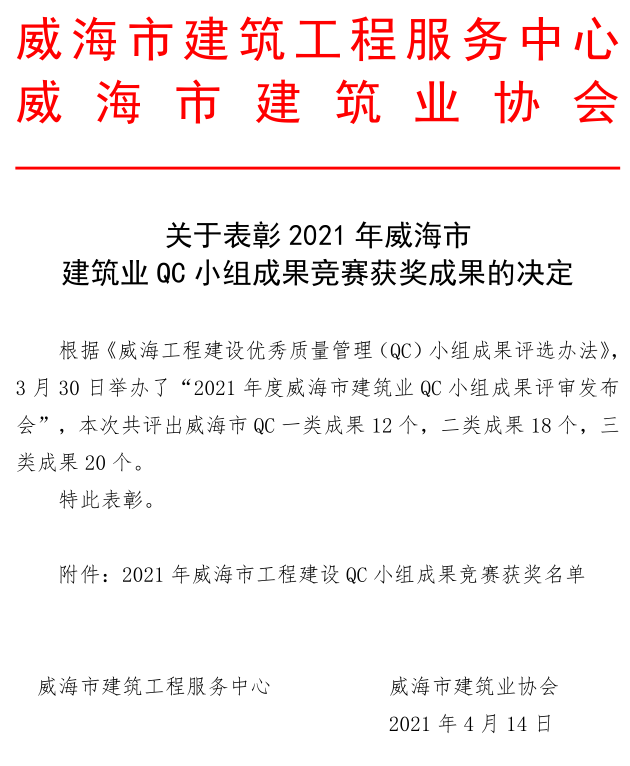 >關(guān)于表彰2021年威海市 建筑業(yè)QC小組成果競賽獲獎成果的決定