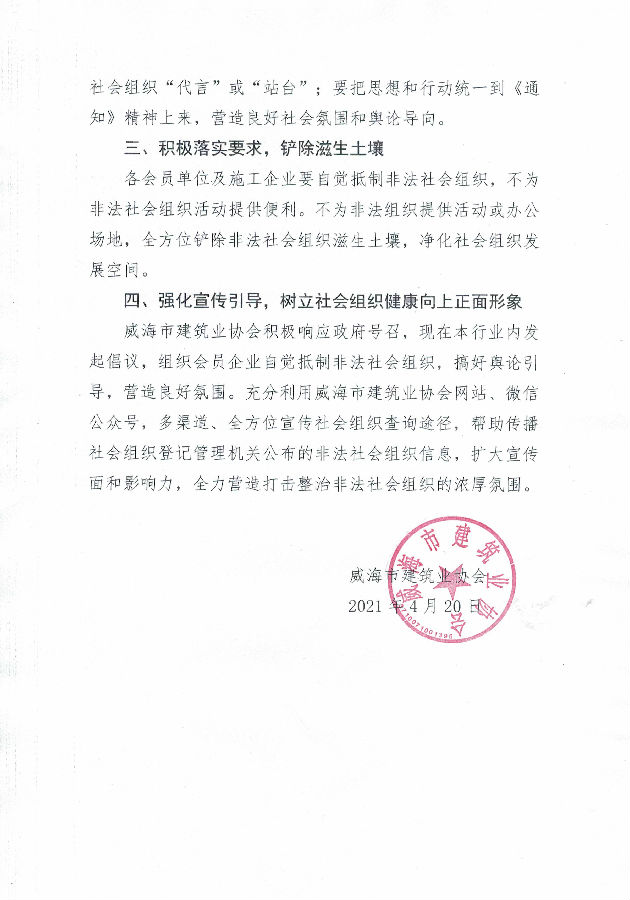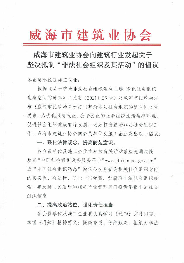 >威海市建筑業(yè)協(xié)會向建筑行業(yè)發(fā)起關(guān)于 堅決抵制“非法社會組織及其活動”的倡議