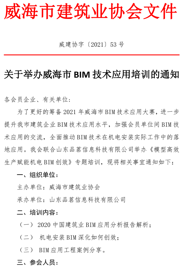 關(guān)于舉辦威海市BIM技術(shù)應(yīng)用培訓(xùn)的通知