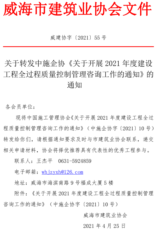 >關(guān)于轉(zhuǎn)發(fā)中施企協(xié)《關(guān)于開展2021年度建設(shè)工程全過程質(zhì)量控制管理咨詢工作的通知》的通知?
