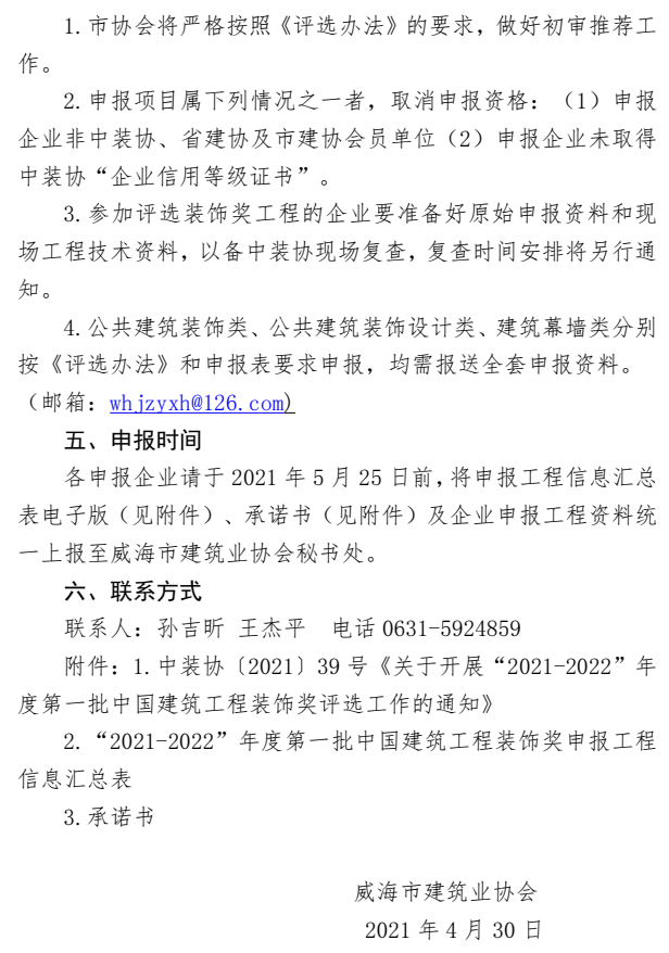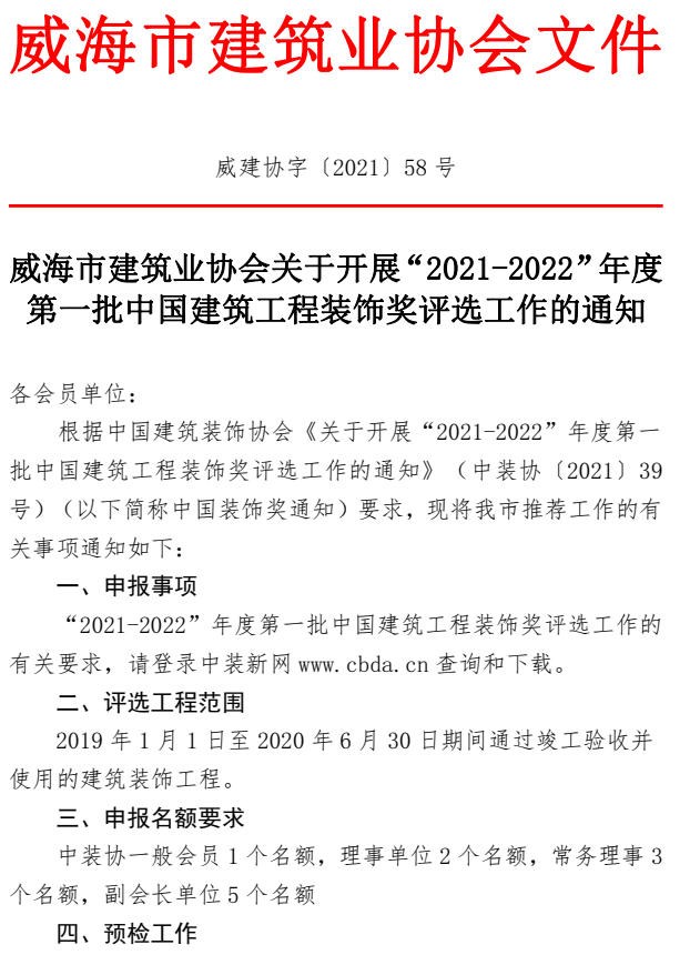 >威海市建筑業(yè)協(xié)會關(guān)于開展“2021-2022”年度第一批中國建筑工程裝飾獎評選工作的通知