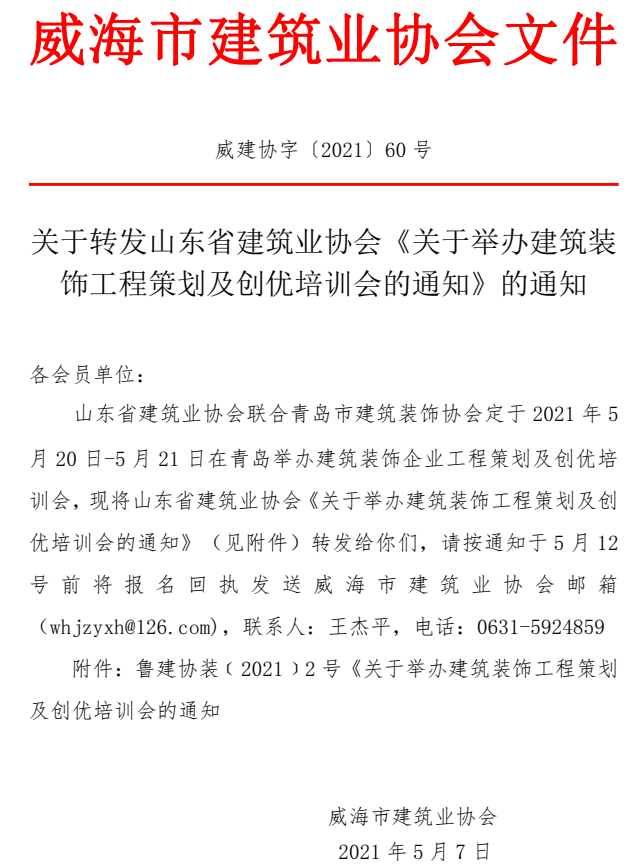 - 當(dāng)前位置:首頁 >文件公告>關(guān)于轉(zhuǎn)發(fā)山東省建筑業(yè)協(xié)會(huì)《關(guān)于舉辦建筑裝飾工程策劃及創(chuàng)優(yōu)培訓(xùn)會(huì)的通知》的通知