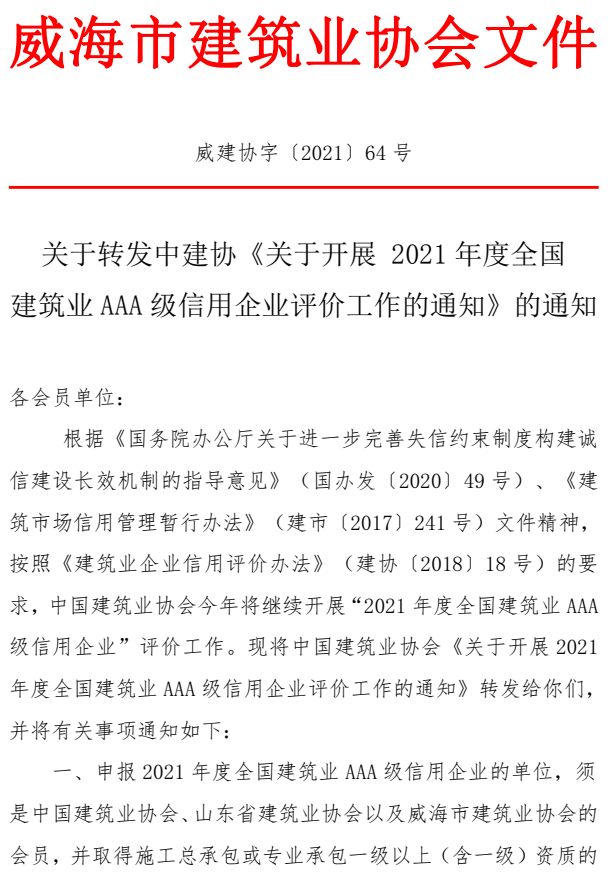 關(guān)于轉(zhuǎn)發(fā)中建協(xié)《關(guān)于開展 2021年度全國(guó) 建筑業(yè)AAA級(jí)信用企業(yè)評(píng)價(jià)工作的通知》的通知