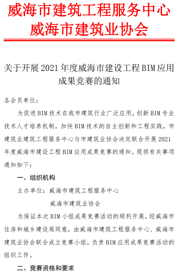 >關(guān)于開(kāi)展2021年度威海市建設(shè)工程BIM應(yīng)用 成果競(jìng)賽的通知