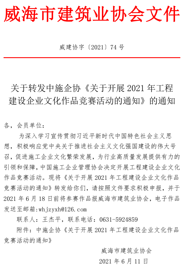 關(guān)于轉(zhuǎn)發(fā)中施企協(xié)《關(guān)于開展2021年工程 建設(shè)企業(yè)文化作品競(jìng)賽活動(dòng)的通知》的通知