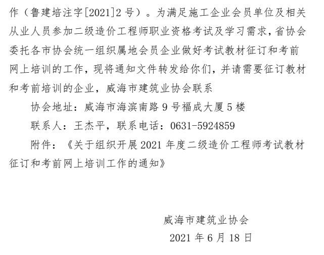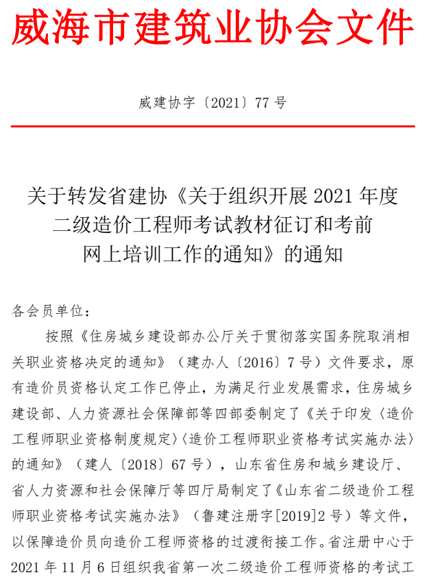 關(guān)于轉(zhuǎn)發(fā)省建協(xié)《關(guān)于組織開展2021年度 二級造價工程師考試教材征訂和考前 網(wǎng)上培訓(xùn)工作的通知》的通知