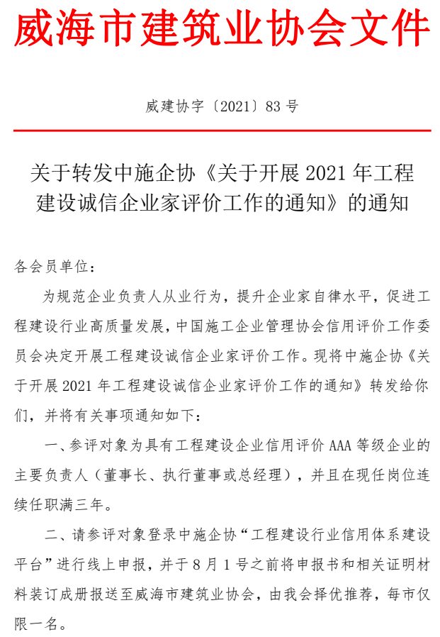>關(guān)于轉(zhuǎn)發(fā)中施企協(xié)《關(guān)于開展2021年工程 建設(shè)誠信企業(yè)家評價工作的通知》的通知