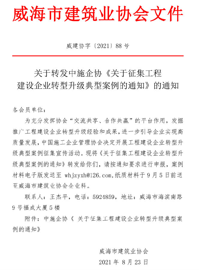 關(guān)于轉(zhuǎn)發(fā)中施企協(xié)《關(guān)于征集工程 建設(shè)企業(yè)轉(zhuǎn)型升級典型案例的通知》的通知