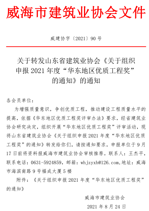 >關于轉發(fā)山東省建筑業(yè)協(xié)會《關于組織 申報2021年度“華東地區(qū)優(yōu)質工程獎” 的通知》的通知
