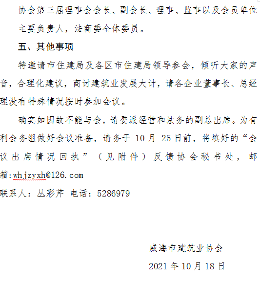 關于召開威海市建筑業(yè)協(xié)會第三屆理事會第三次會議暨?三屆二次會長辦公會、法商委第二次會議通知