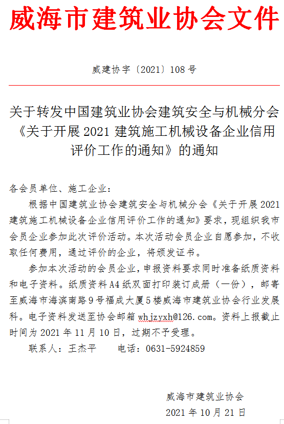 省建筑安全與設備管理協(xié)會關于組織參加中國建筑業(yè)協(xié)會建筑安全與機械分會2021年度建筑施工機械設備企業(yè)信用評價工作的通知.zip