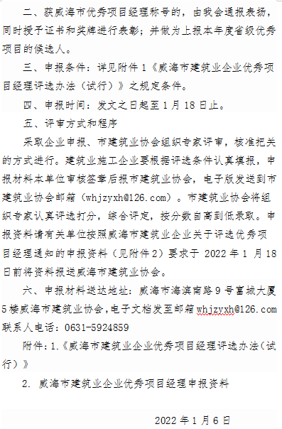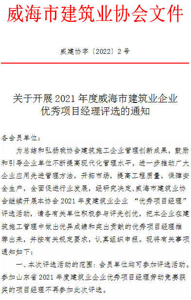 關(guān)于開展2021年度威海市建筑業(yè)企業(yè)優(yōu)秀項目經(jīng)理評選的通知