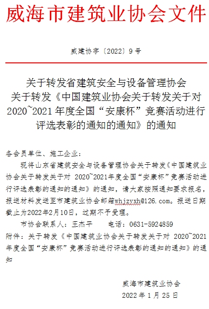關(guān)于轉(zhuǎn)發(fā)《中國建筑業(yè)協(xié)會關(guān)于轉(zhuǎn)發(fā)關(guān)于 對 2020~2021 年度全國“安康杯”競賽活動 進行評選表彰的通知的通知》的通知