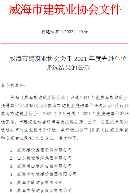 >威海市建筑業(yè)協(xié)會關于2021年度先進單位評選結果的公示