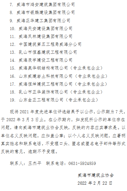 威海市建筑業(yè)協(xié)會關于2021年度先進單位評選結果的公示