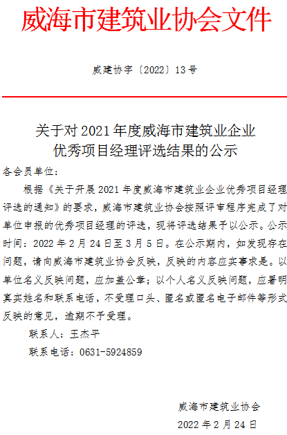 關(guān)于對(duì)2021年度威海市建筑業(yè)企業(yè)優(yōu)秀項(xiàng)目經(jīng)理評(píng)選結(jié)果的公示