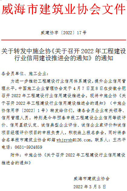 關(guān)于轉(zhuǎn)發(fā)中施企協(xié)《關(guān)于召開(kāi)2022年工程建設(shè)行業(yè)信用建設(shè)推進(jìn)會(huì)的通知》的通知