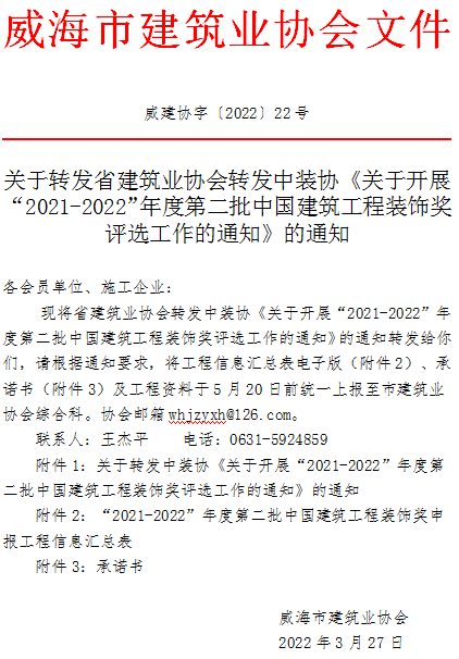 關(guān)于轉(zhuǎn)發(fā)省建筑業(yè)協(xié)會轉(zhuǎn)發(fā)中裝協(xié)《關(guān)于開展“2021-2022”年度第二批中國建筑工程裝飾獎評選工作的通知》的通知