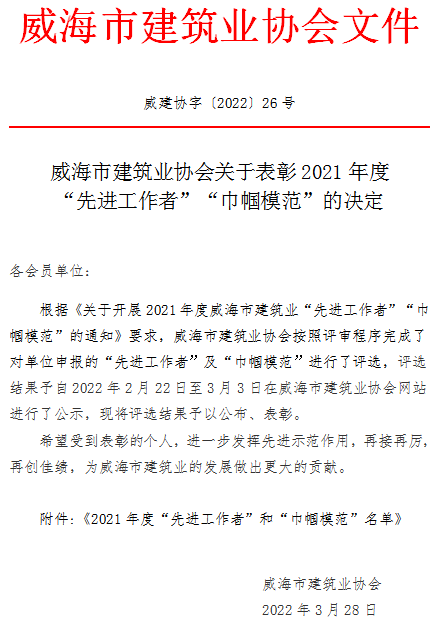 >威海市建筑業(yè)協(xié)會(huì)關(guān)于表彰2021年度“先進(jìn)工作者”“巾幗模范”的決定